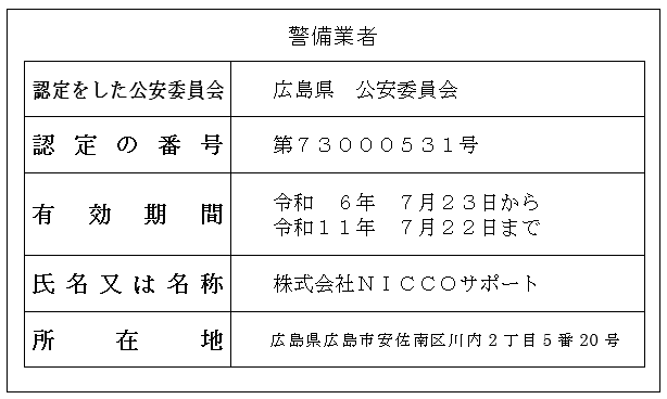 警備業者標識 周辺地図 株式会社NICCOサポート (防犯サポート.com)〒731-0102 広島県広島市安佐南区川内2丁目5-20(株式会社NICCO内) 関連会社 株式会社NICCO 株式会社NICCOトレード 株式会社NICCOライフ